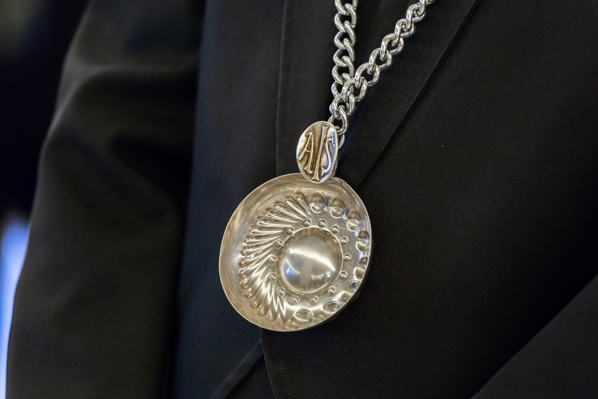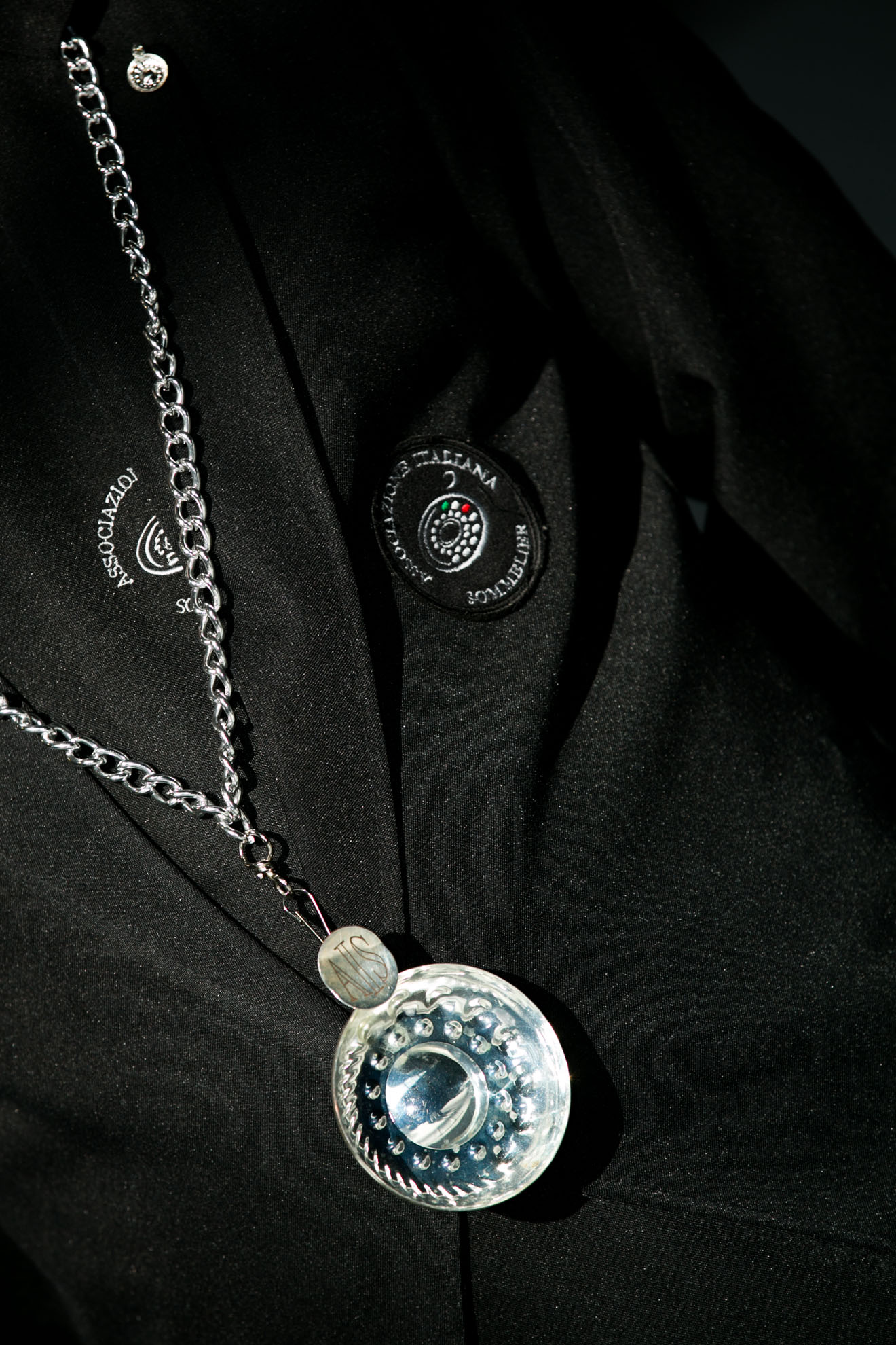 Spilla tastevin sul bavero sinistro della giacca insegna associativa AIS di rappresentanza (cosiddetto “scudetto”) su tasca superiore sinistra della giacca.