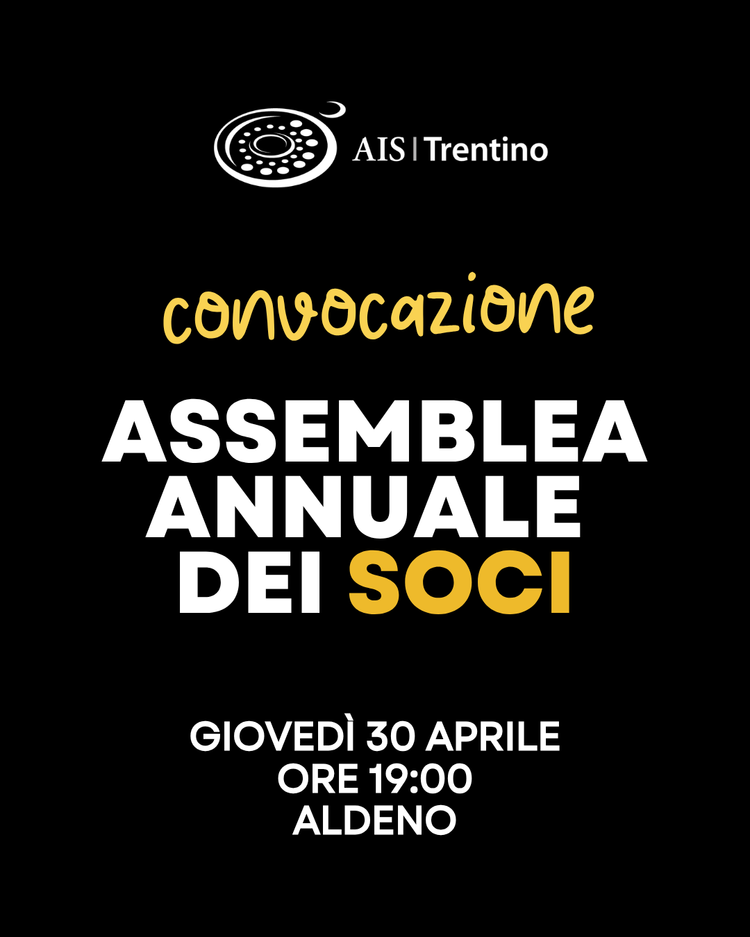 Si informano tutti i soci iscritti ad AIS Trentino che è convocata l'Assemblea ordinaria dei soci per l’approvazione del bilancio che si terrà